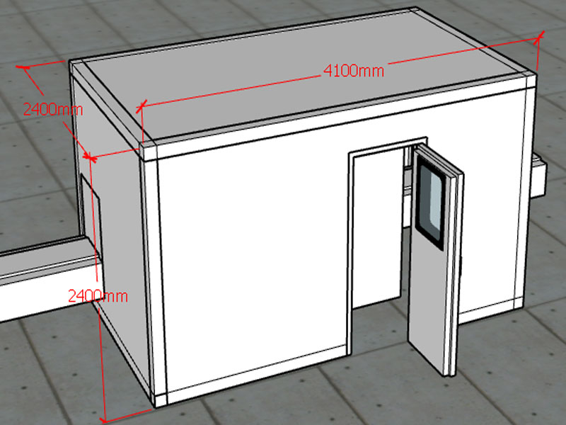 1.1.1根据我司技术人员现场测量,流水线处环境噪声为75-78dB(A),设计隔音房尺寸为:2400mm*4100mm*2400mm。隔音房板厚120mm,预计隔音房安装完成后,内部噪声值降至40dB(A)。
