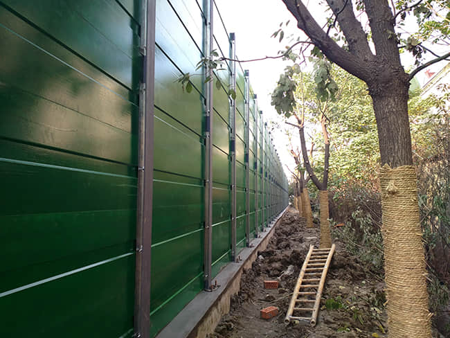 3、 隔声屏障屏体。考虑到降噪工程的使用寿命,我们采用75mm厚金属吸隔声屏体作为降噪结构,平均吸声系数在0.80以,屏体内部用多层憎水玻璃棉与纤维布结构。