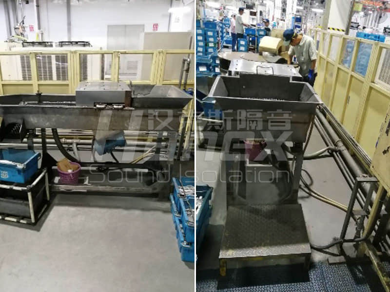 观察窗:在隔音罩的进料口移门上设置1扇塑胶玻璃观察窗,玻璃使用橡胶垫保护,同时辅以玻璃胶密封,为提高隔音量设计使用2层有机玻璃。观察窗规格为:W300×H300mm方便在设备运行时对内部情况进行实时观察。