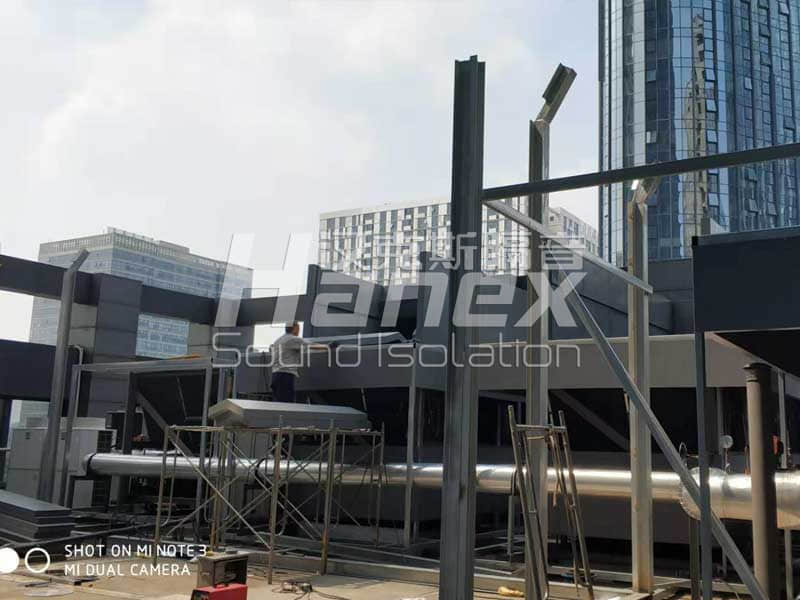 3、根据现场实际情况,空调机组底部的压缩机周围无阻挡,我司技术人员发现压缩机工作运行时所产生的噪声往外扩散,影响其周边环境。因此,我司技术人员结合以往同类项目案例经验,采用隔音板对空调机组底部压缩机四周进行围挡,控制其工作产生的噪声往外扩散。同时从空调机组顶部做500mm隔声挂板,防止压缩机产生的噪声从顶部溢出扩散到周围环境。