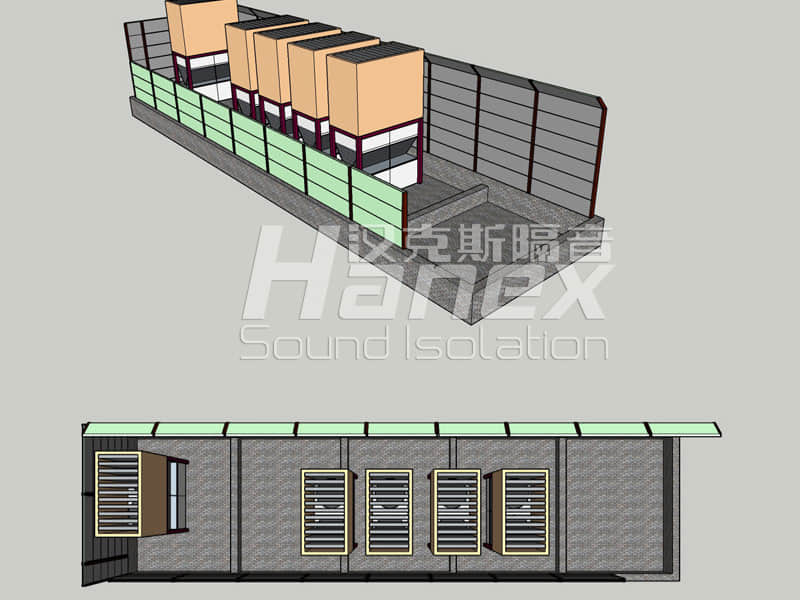 安装出风消声器后,设备出风口噪声大幅度的降低,为进一步提高降噪效果,同时保障设备正常运行,在设备的北面与西面安装高3.5米的吸隔声屏障。设备的南面安装高1.5米的声屏障。屏障采用H型钢立柱,安装在女儿墙上。