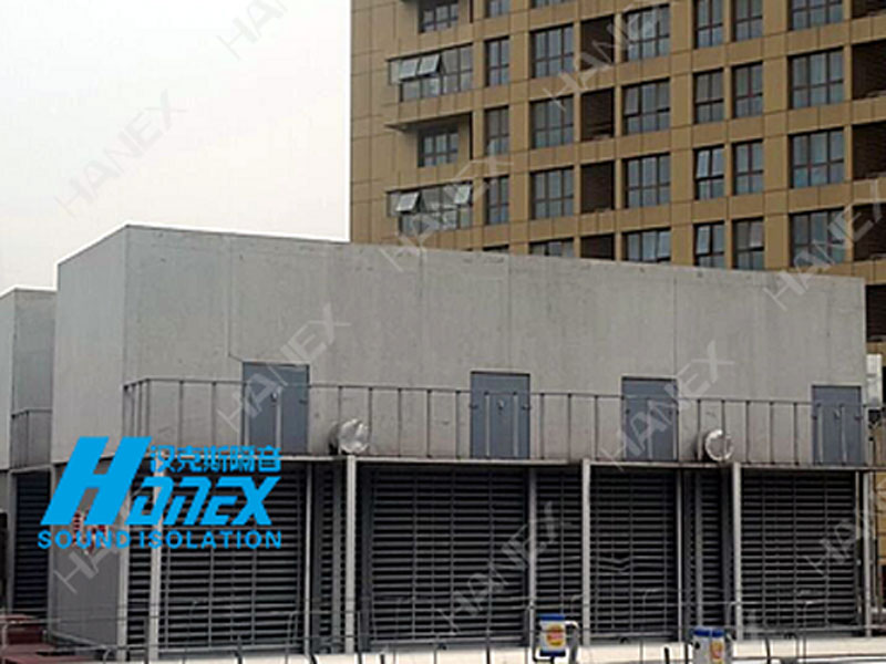 德盈广场东面3组冷却塔设备正常运行产生90-95分贝噪声,对周边公寓、酒店、办公区造成不良影响。汉克斯隔音设计1.冷却塔出风口消声器,2.冷却塔四周安装吸隔声屏障,工程结束后敏感区噪声测量值低于45分贝。
